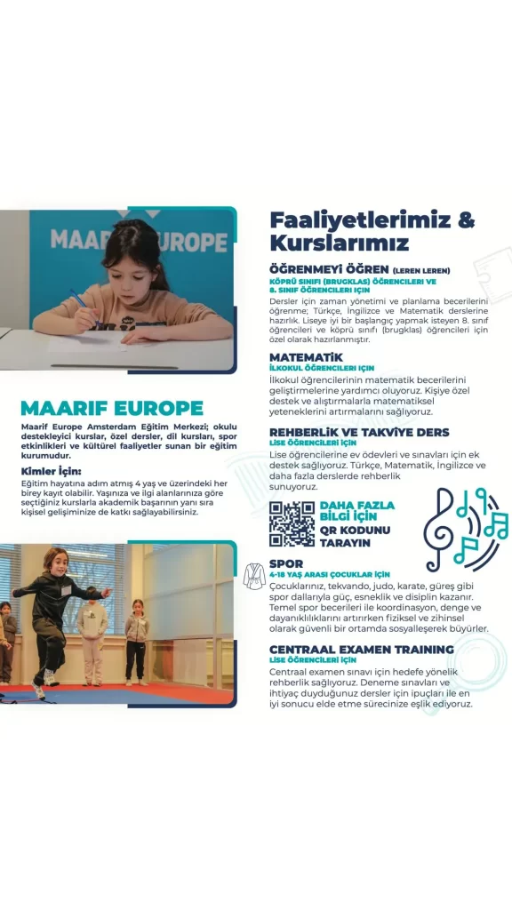 Maarif Europe Amsterdam Educatiecentrum biedt een breed scala aan ondersteunende lessen en cursussen voor kinderen en jongeren. Van wiskunde- en taallessen tot sport, muziek en huiswerkbegeleiding – hier wordt gewerkt aan zowel academische prestaties als persoonlijke ontwikkeling. Meer informatie is beschikbaar via de QR-code op de flyer of via www.maarifeurope.nl.