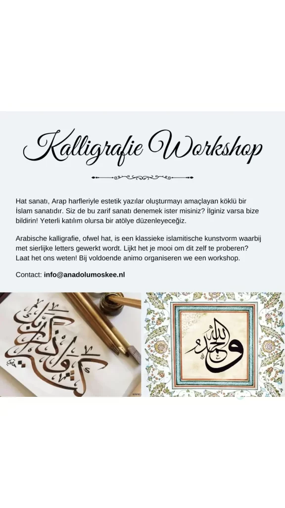Maak kennis met de sierlijke kunst van de Arabische kalligrafie, ook bekend als ‘Hat’. In deze workshop leren deelnemers hoe zij met Arabische letters prachtige, esthetische ontwerpen kunnen maken. Een unieke kans voor liefhebbers van kunst en cultuur. Aanmelden kan via info@anadolumoskee.nl.
