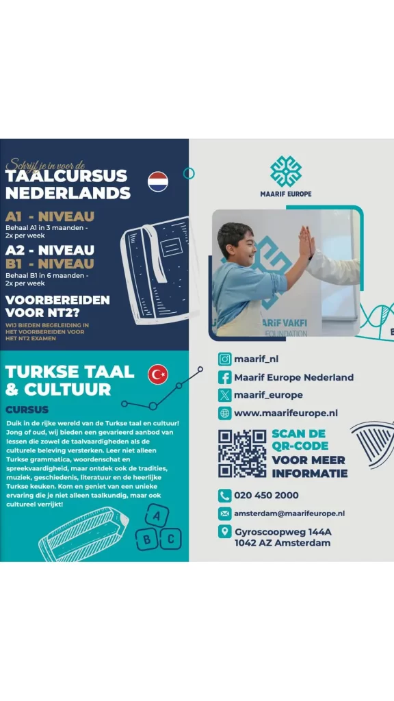 Maarif Europe biedt taalcursussen voor verschillende niveaus: van beginners (A1) tot gevorderden (B1), met begeleiding voor het NT2-examen. Daarnaast is er een cursus Turkse Taal & Cultuur, waarin deelnemers niet alleen de taal leren, maar ook de rijke tradities, muziek en geschiedenis ontdekken. Inschrijven kan via www.maarifeurope.nl.