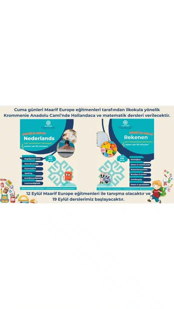 📚 Nieuwe lessen bij Krommenie Anadolu Moskee!Vanaf 19 september starten er lessen Nederlands en Rekenen voor basisschoolleerlingen, gegeven door ervaren docenten van Maarif Europe. 🗓️ Iedere vrijdag📍 Krommenie Anadolu Moskee⏰ Lesduur: 90 minuten💶 Kosten: vanaf €16 per les Vakken:➡️ Nederlands: Begrijpend lezen, Woordenschat, Grammatica, Spelling, Schrijf- en leesvaardigheid.➡️ Rekenen: Klokkijken, Meten & meetkunde, Redactiesommen, Breuken […]